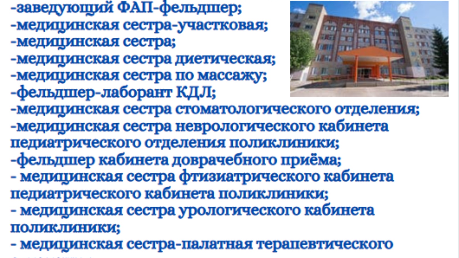 В ГАУЗ "Менделеевская ЦРБ" открыты вакансии на следующие специальности: