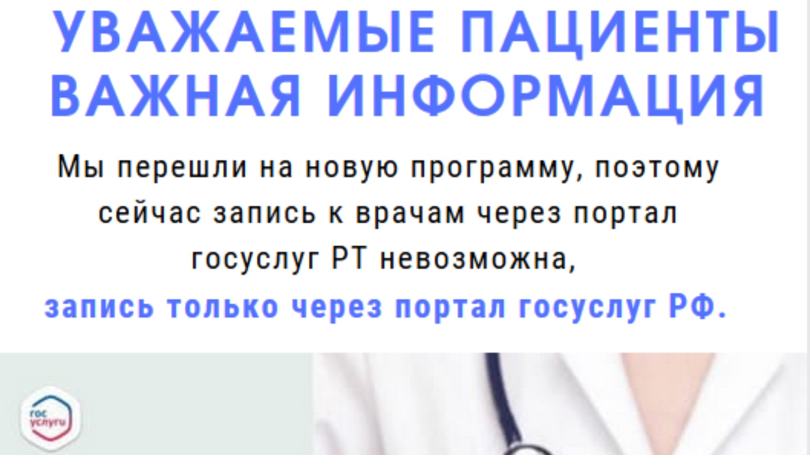 Уважаемые пациенты Важная информация Мы перешли на новую программу, поэтому сейчас запись к врачам через портал госуслуг РТ невозможна, запись только через портал госуслуг РФ.