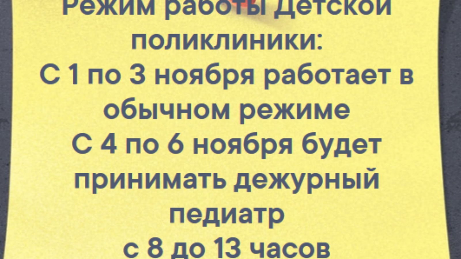 Режим работы Детской поликлиники: С 1 по 3 ноября работает в обычном режиме С 4 по 6 ноября будет принимать дежурный педиатр с 8 до 13 часов Подробности по телефону 2-15-56