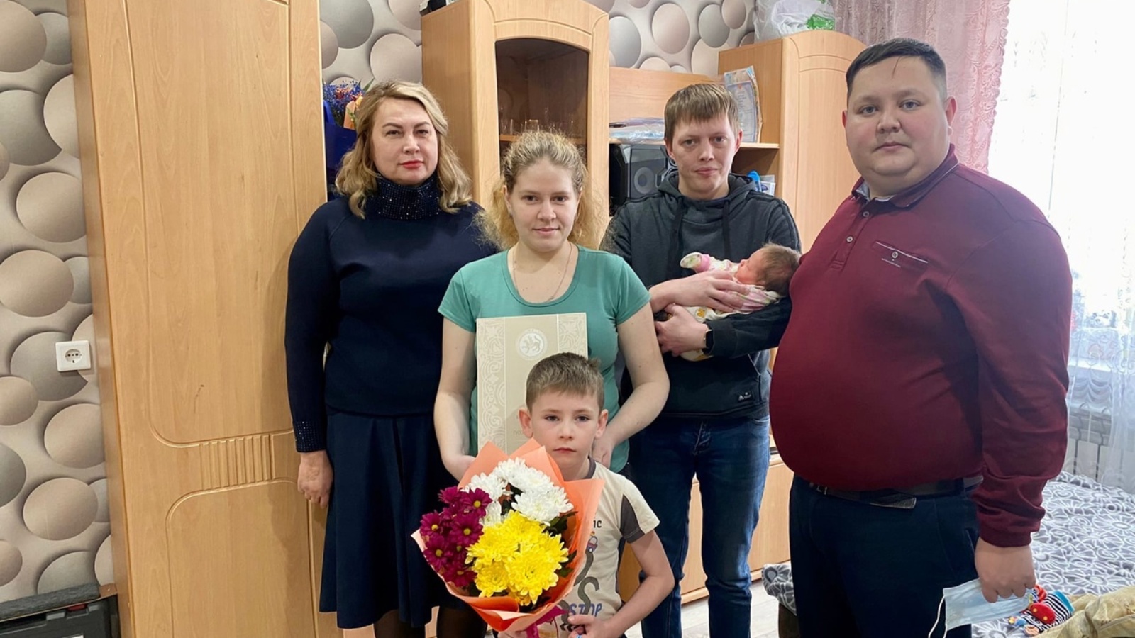 Әлеге вакыйга белән гаиләне башкарма комитет җитәкчесенең социаль мәсьәләләр буенча урынбасары вазифасын башкаручы Айдар Сәфәргалин, районның ЗАГС бүлеге начальнигы Татьяна Алексеева котладылар. Айдар Нәгыймович район җитәкчесе Радмир Беляев исеменнән җылы котлау сүзләре юллады, бүләк һәм чәчәк бәйләме тапшырды.