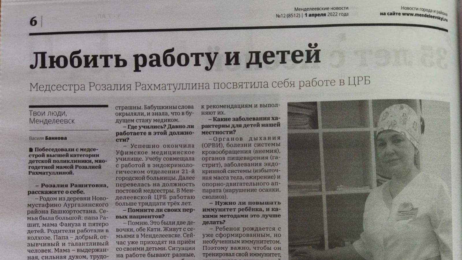Интервью с Рахматуллиной Розалией медицинской сестрой детской поликлиники Менделеевской ЦРБ.