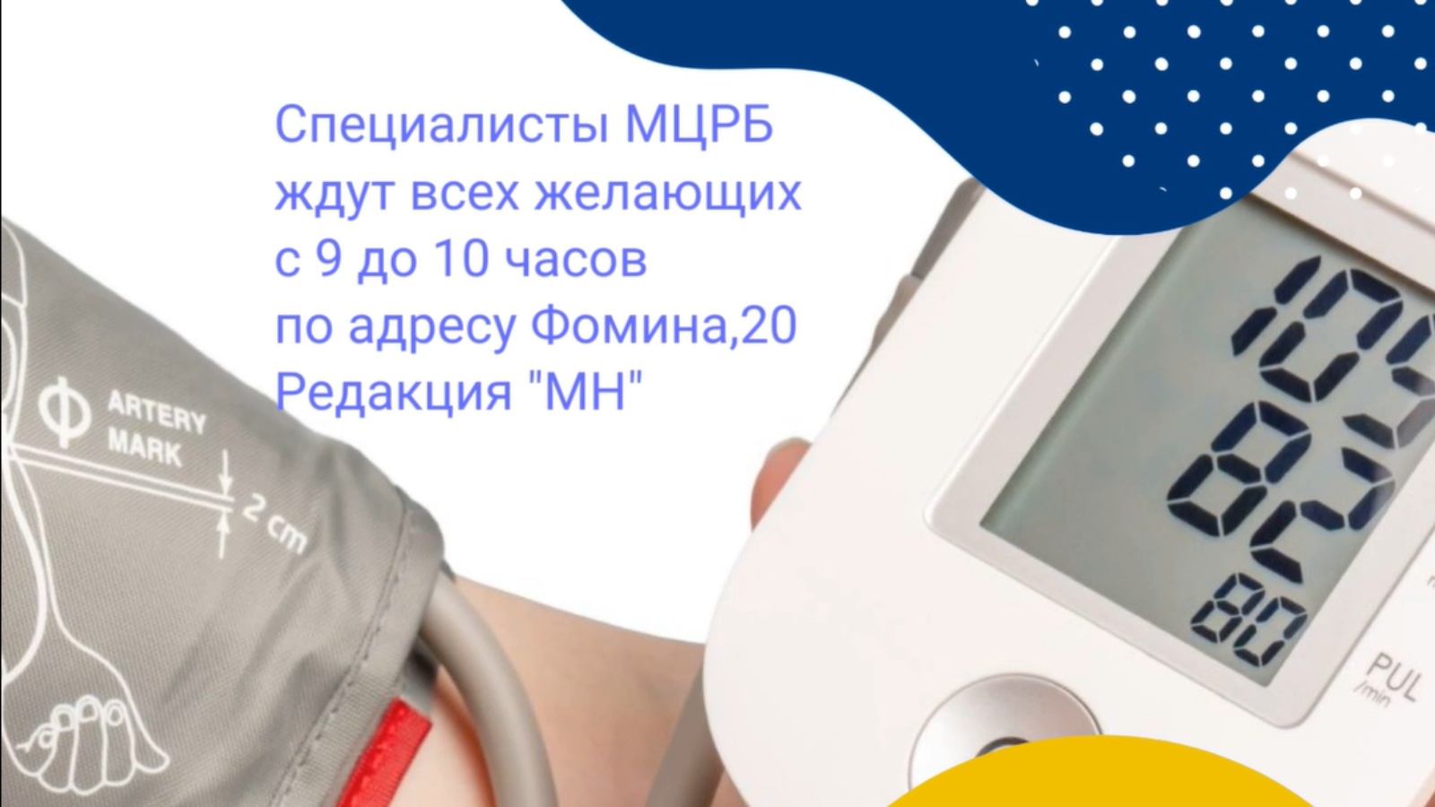 29 июля 2022 года в редакции газеты «Менделеевские новости» по адресу Фомина, 20 сотрудники Центральной районной больницы будут ждать всех желающих с 9 до 10 часов для измерения артериального давления и дать необходимую консультацию специалиста.
