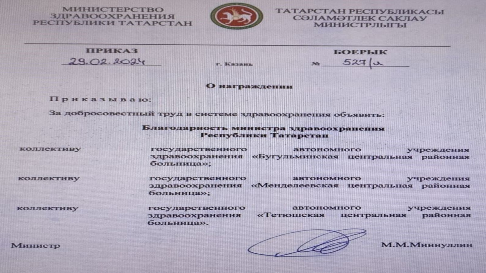 Благодарность Министра здравоохранения Республики Татарстан