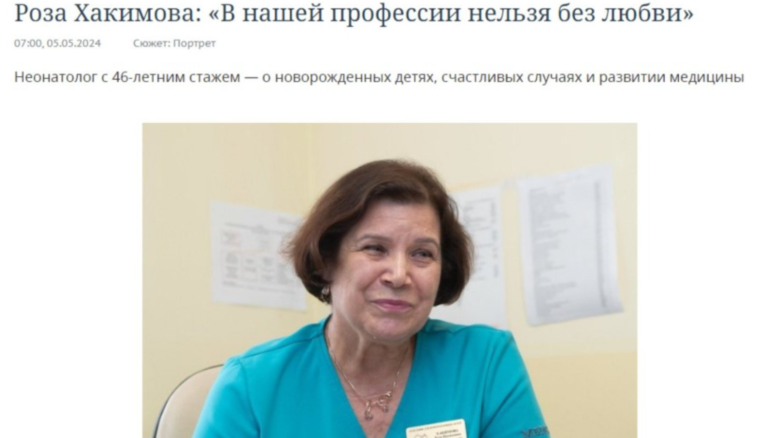 Роза Хакимова, врач-неонатолог высшей категории, заслуженный врач Татарстана, уже 42 года работает в отделении для новорожденных детей Перинатального центра РКБ. Она рассказала (https://realnoevremya.ru/articles/308339-roza-hakimova-v-nashey-professii-nelzya-bez-lyubvi) "Реальному времени", что самое главное в профессии.