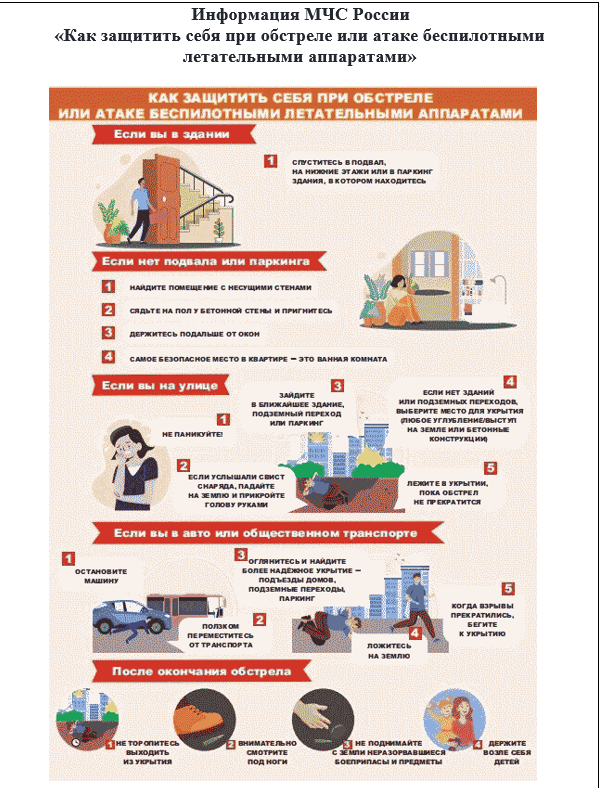 Памятка населению о правилах поведения при возникновении опасности атаки БПЛА Найдите укрытие. При обнаружении приближающегося дрона или звука взрыва немедленно ищите надежное укрытие - подвал, бетонное здание или любое другое место, которое может защитить от осколков и ударной волны. Избегайте открытых пространств. На открытой местности вы становитесь легкой мишенью. Старайтесь передвигаться по защищенным маршрутам, использовать здания, деревья и другие объекты для маскировки. Будьте внимательны к звукам и световым сигналам. Часто дроны издают характерный шум, а при атаке могут быть видны вспышки или дым. Это поможет вовремя среагировать и принять меры. ПРИЗНАКИ БПЛА